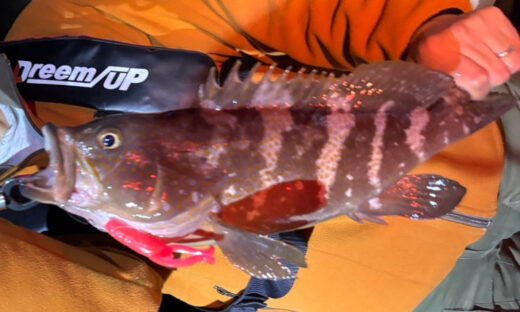 カラーはUVアーミーグローをメインに使用。普段はホワイトグローやスーパーグローピンクなどをよく使うのですが、満月回りの潮なのでワームシルエットをもう少しぼかした感じが良かったのかなと思います。