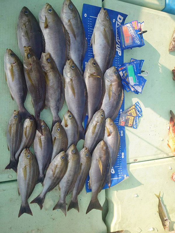 現状は40〜50m位のエリアのボトムから10m位で良く釣れている感じで『巻き巻きキャロ』の方がボトムを取ってから巻いて来るだけなので、初めてチャレンジする時には取っつきやすい感じです。