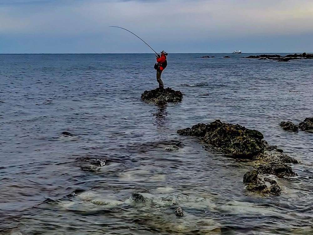 立てる岩から目先の2〜30メートルは、藻がびっしりで探ることすら困難で、その沖は若干深いところもあり(といっても5〜6メートルほど)海底がガチャガチャな岩礁なのでそこを狙う。