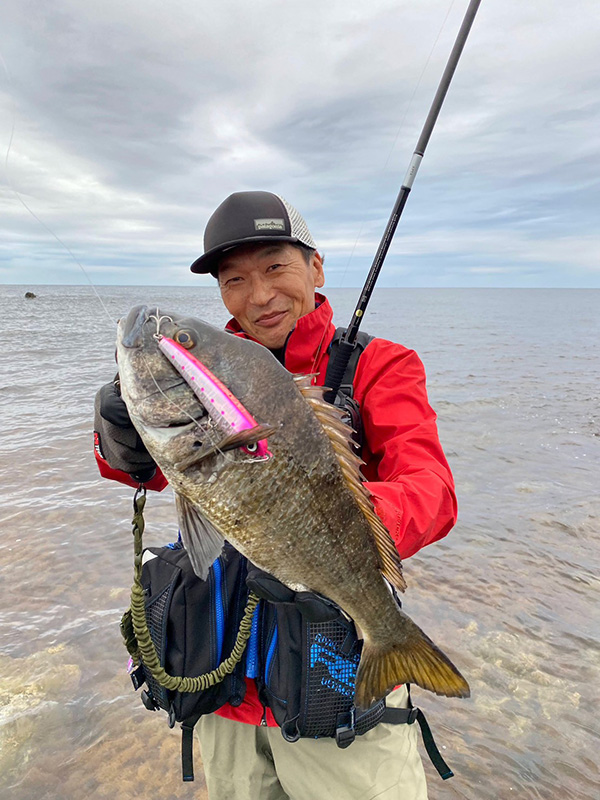 岩々を転々としながら攻めづらい地形に苦戦、ジワリジワリとモチベーションが落ちて行くなかで、同行の平山氏がトップで良型チヌ。