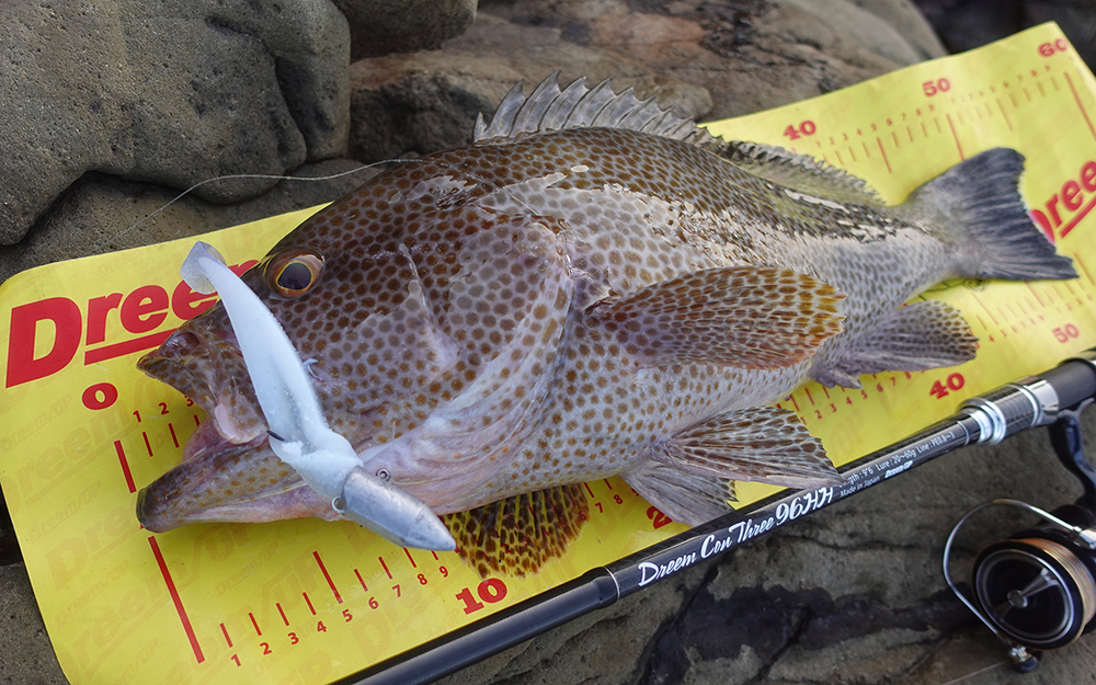 足元から水深が20mとドン深で、島と島の間を強烈な潮流ができて60gがないと底取りも不可な状況。フリーフォールで落としていって着底がぼやけてしまうくらいの状況でもオオモンハタのバイトを感じることができ、途中で根に張り付かれながらもバットパワーで引き剥がしてキャッチした55cm。