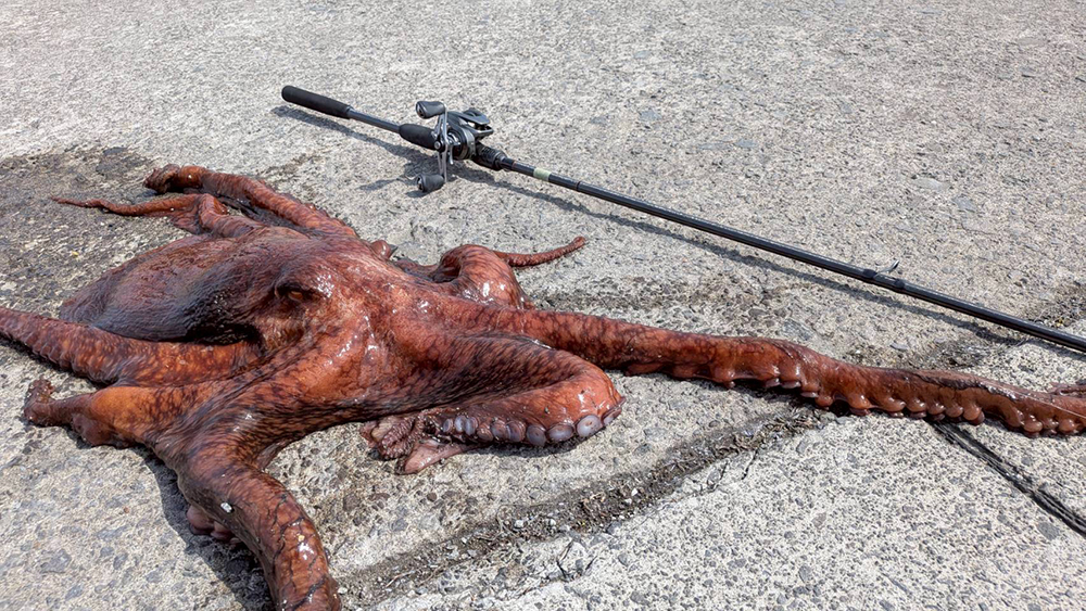 99HB(プロト)1本に(ピクシーシャッド1.6)シンカーは45gでまず一投目…数回アクションを加えた後、いきなりずっしり重たくなり、デカい海藻か誰かの仕掛けか?っと思いながら、竿の強さに驚きながらよーく見てみると、巨大なタコでした!たぶん10㌔以上あったと思います。