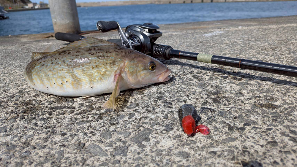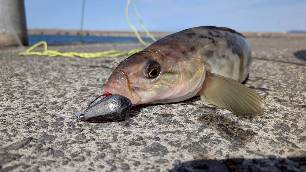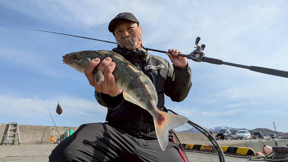 その後はホッケ狙いで船道付近のポイントへ再びキャストしボトムをズル引くと…良いサイズのホッケをキャッチ。