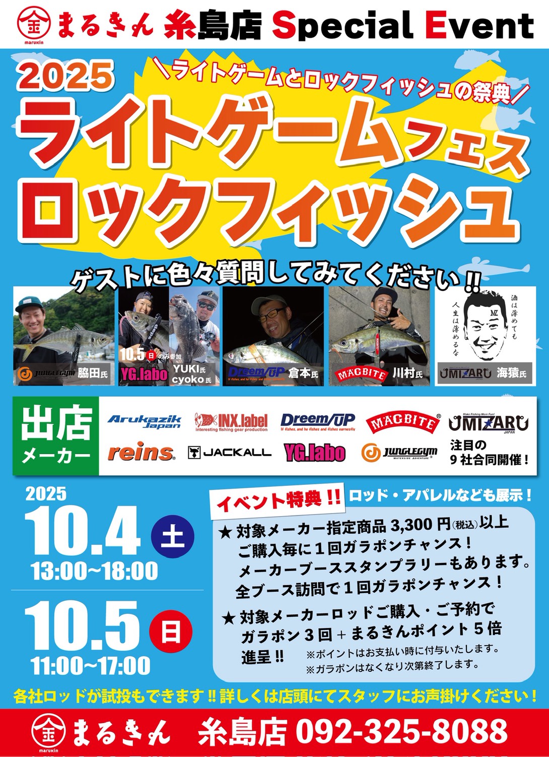 10月4日(土)13:00~18:00、5日(日)11:00~17:00、福岡県糸島市の「まるきん糸島店」で開かれるイベント「2025 ライトゲームフェス ロックフィッシュ」に当社も出展いたします。3,300円(税込み)以上購入ごとに1回ガラポンチャンス! また、ロッド購入・予約でガラポン3回+まるきんさまのポイント5倍などの特典があります。ぜひ遊びにきてください。
