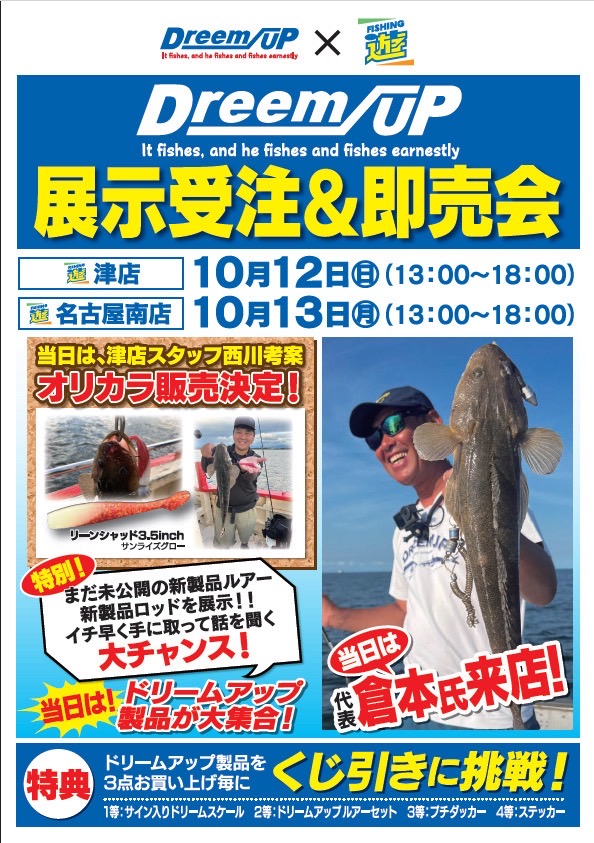 10月12日(日)13:00~18:00 三重県津市のフィッシング遊津店で、翌13日(月)は名古屋市のフィッシング遊名古屋南店で、それぞれ「展示受注&即売会」を開催します。