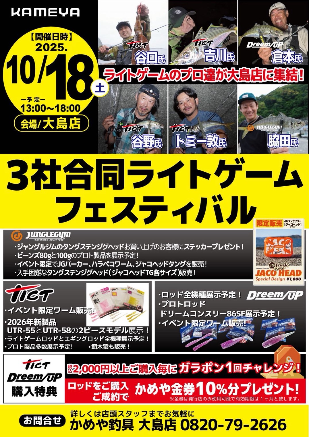 10月18日(土)13:00~18:00 山口県のかめや釣具大島店で開かれる「3社合同ライトゲームフェスティバル」に出展します。プロトロッドの展示の他、イベント限定ワームの販売などがあります。
